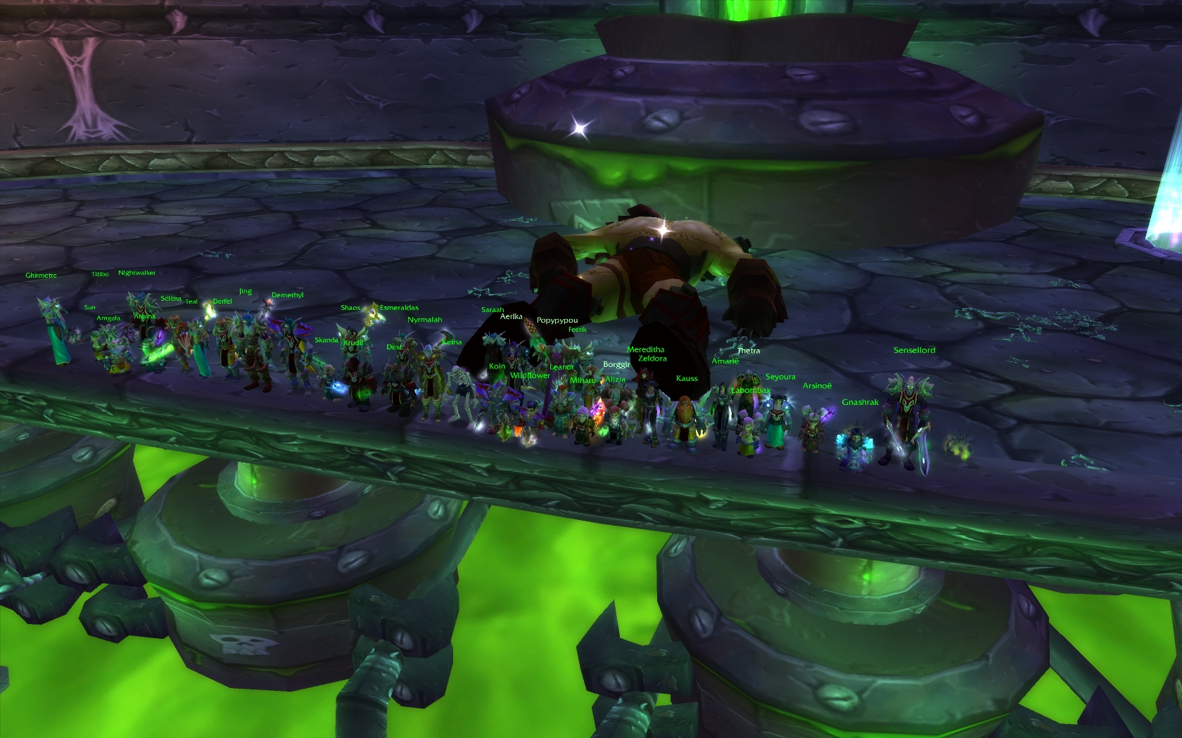 Bref le cauchemar est terminé, et on peut enfin looter (ffs!). Une tête T3 pour Aerika, un masque d'horreur T3 pour Miharu (le T3 démoniste c'est magnifique, hinhinhin), et une masse "sucette" pour Wildflower.