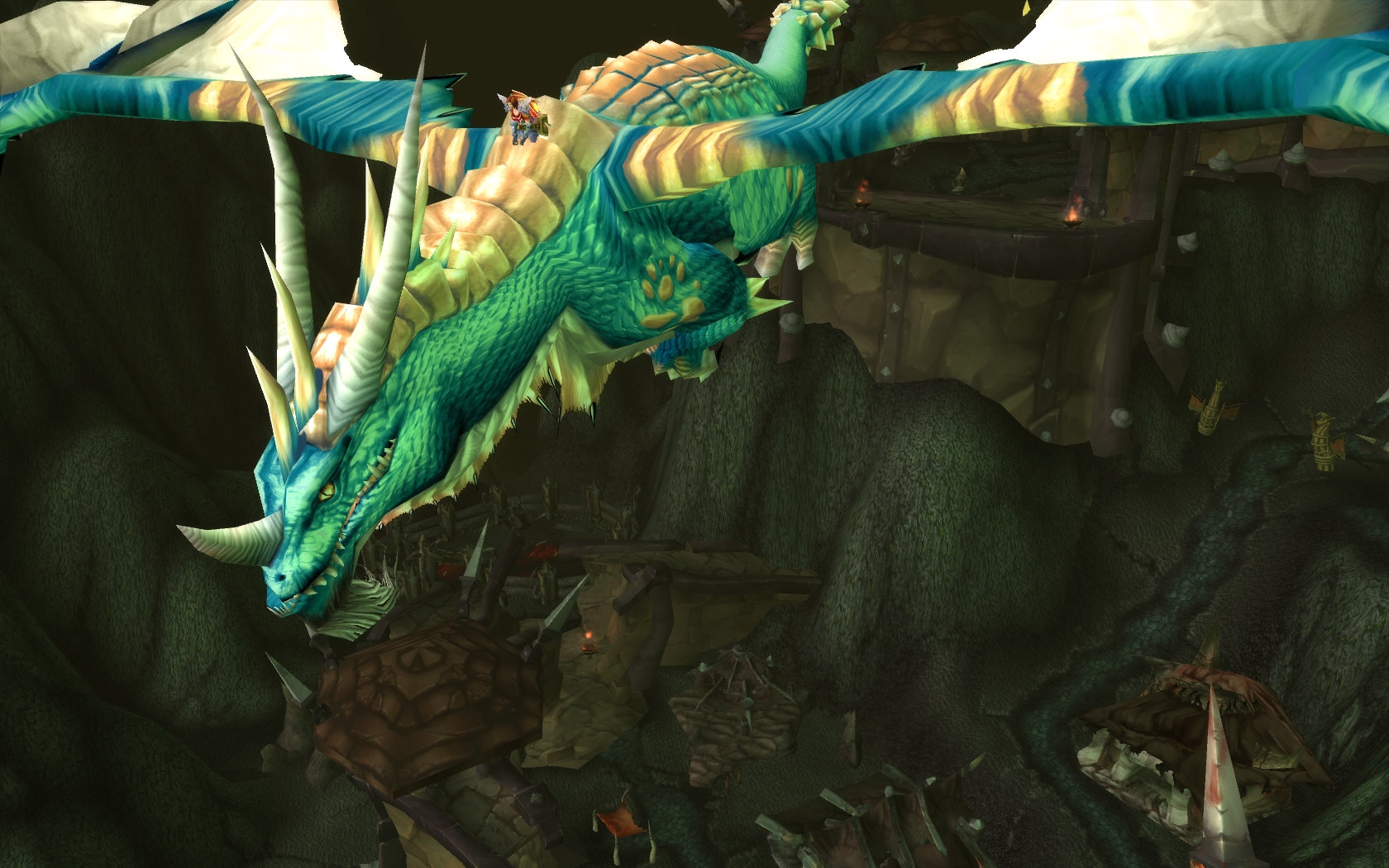 Il faut l'admettre, BC est une réussite du point de vue des zones et des quêtes. Tous les jours, le rituel se répètait: on débarque dans une zone, on harcèle tous les points d'exclamation qu'on trouve, on fait un pull de quelques mobs variés à l'aoe, on voit combien ça déclenche de quêtes, et celles-ci on les lit, pour être bien content de savoir que Jean Michel Gangrenéant a besoin qu'on lui rapporte 15 lobes d'oreille droite de maman talbuk. Enormément de quêtes, dont pas mal de suites qui en apprennent pas mal sur l'histoire, on en oubliait presque que pendant ce temps les gens devant creusaient l'écart en sautant encore un repas, et puis pas mal de quêtes originales. Le tout dans des décors généralement magnifiques, et chaque coin de zone est rempli et exploité par une quête: il n'y a pas de Badlands dans BC ! De temps en temps, un petit tour en instance, pour se rendre compte qu'ils ont bien gardé le concepteur de Haches-Tripes plutôt que celui de la Prison de Stormwind (comprendre, les instances sont biens !); et puis voir Thrall se balader sur une monture paladin 40% dans les cavernes du temps, ça n'a pas de prix.